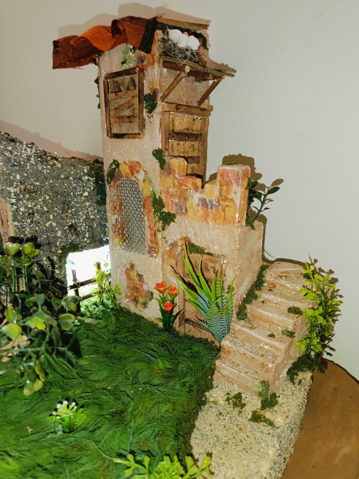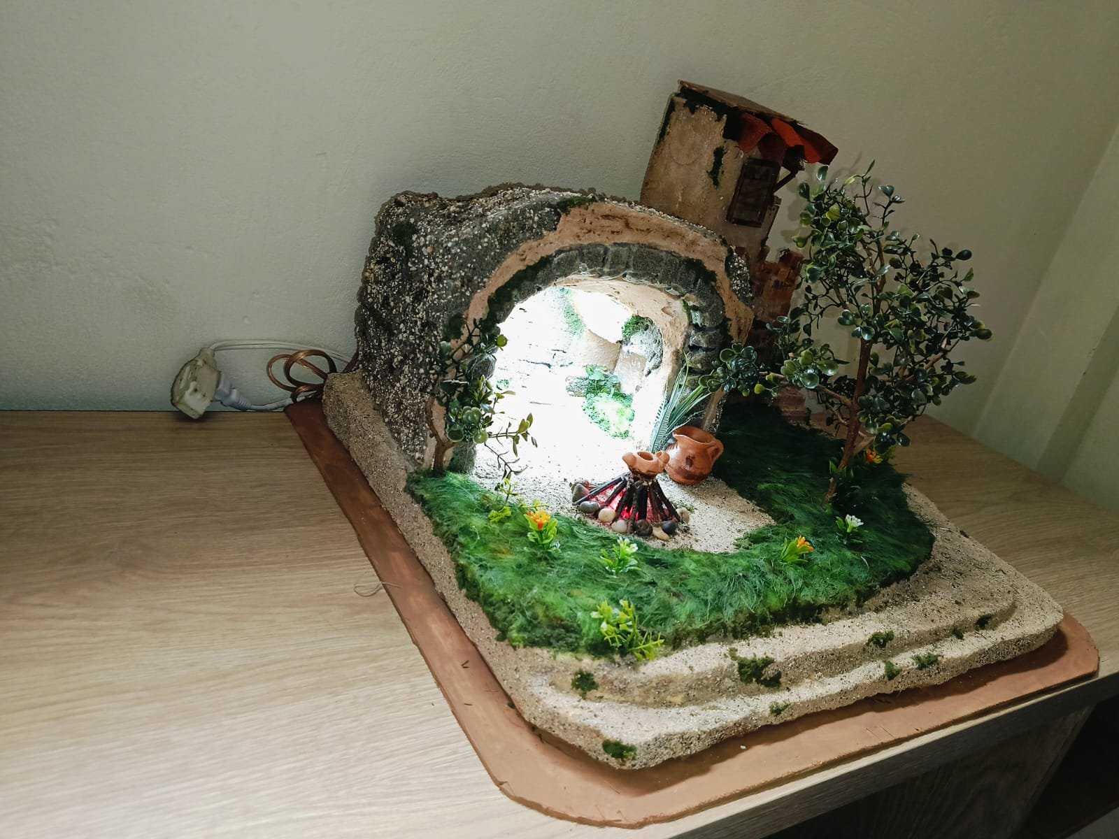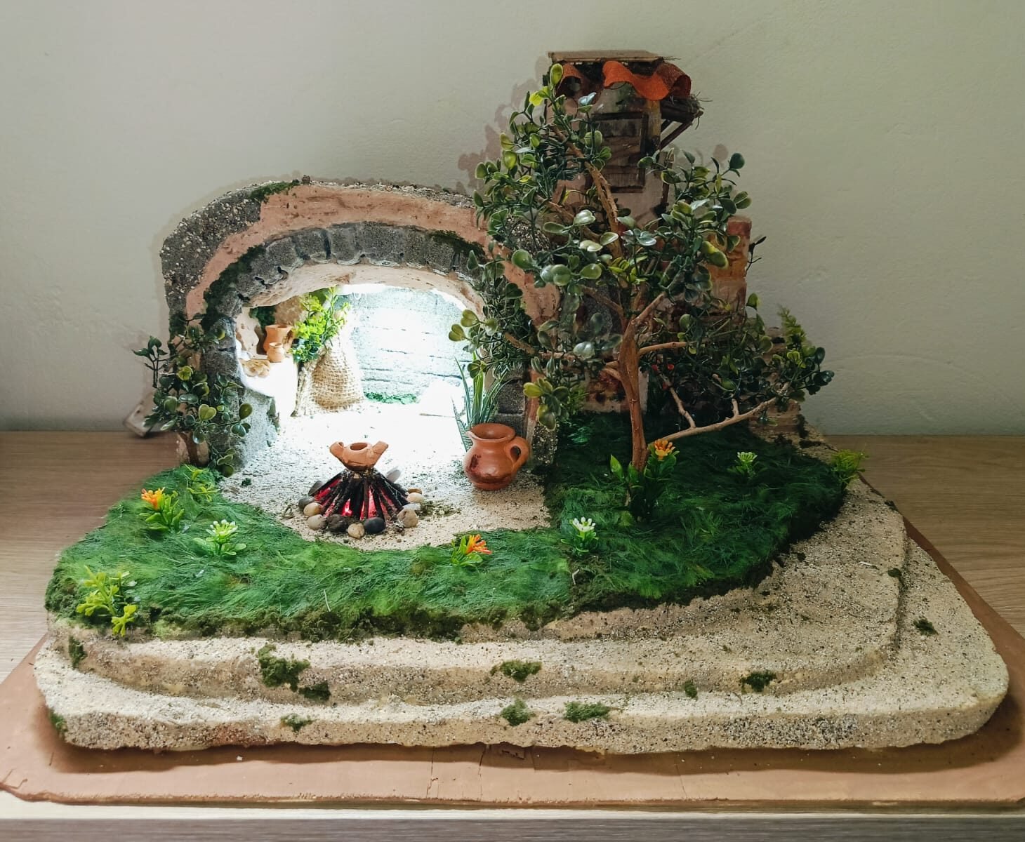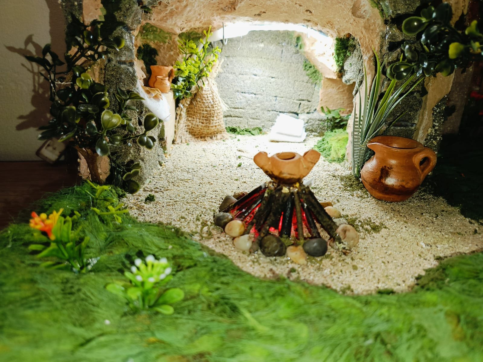 Escena artesanal con cueva iluminada, posada rústica, un hermoso jardín y fogata central. Detalles cuidadosamente trabajados para aportar realismo y calidez a la escena.